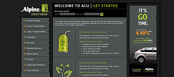 Another one of our Utah locals, Alpine Credit Union, is dawning a new online presence with interactive web controls and a cool graphic interface. It’s a sleek radioactive green and black with cool little images, such as the “teen savers” money tree and the soda car with its twist on low calorie loan percentages.