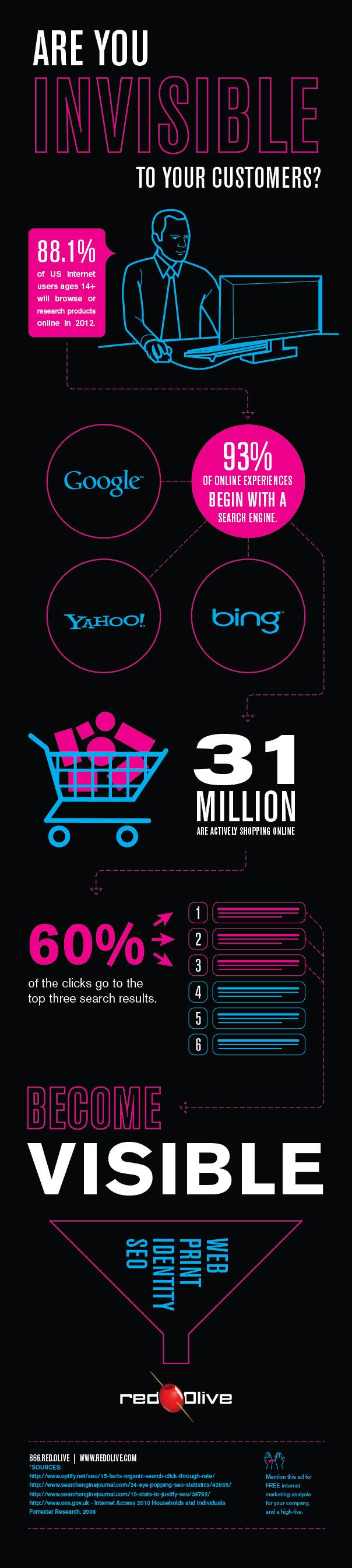 At Red Olive we are capable of making this happen and you will be on the first page for all the world to see. There are other internet marketing channels as well that can also generate great, qualified traffic. So now you know that your website’s invisibility is really a non-issue and can be addressed. Not so troubling after all!