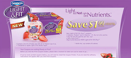 Just another reason to head to the web when you are looking for deals ” print coupons are big time. Dannon’s line of Light & Fit® products are on sale with a quick link and printout of their online coupon ” a generous 1 dollar off coupon that has recently been brushed up by our tenacious gaggle of Utah graphic designers.