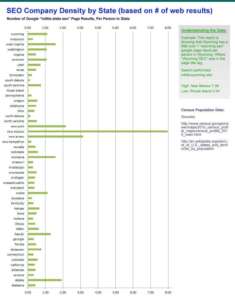 So for Utah, there are .71 Google results (that have “Utah” and “SEO” in the title tag) per person. So there are more people in Utah than results targeting “Utah SEO.” For New Mexico, it appears there are about 8x more results targeting New Mexico SEO than there are people in the state. The “New Mexico” outlier could be explained by the potential for a large number of sites with title tags that are actually targeting just “Mexico” + “SEO” and perhaps “New” was being used in a different part of the page or title tag so it was flagged and added to the results.