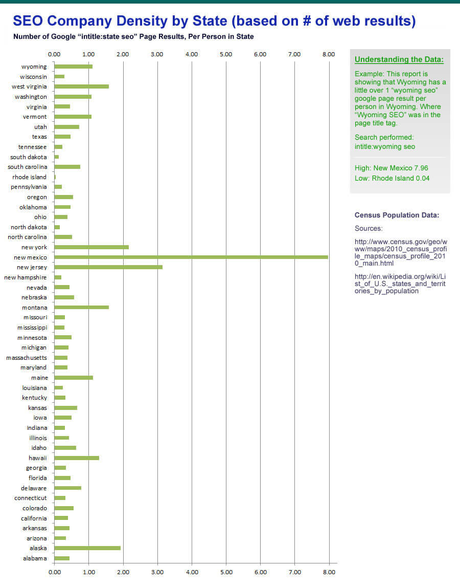 This is not a scientific report, as there are likely caveats to this method as some companies have more than 1 page with their state and SEO in the title tag. But you should still consider these potential duplicate pages from a single company as competition, as every page is competing for a top 10 spot in the search results. Another thing to keep in mind is that while some states may have fewer SEO pages per person compared to other states, it is not saying it would be more or less difficult in these states to rank top 10 for local SEO phrases. This report simply shows the number of Google results for the search: “intitle:[state] seo” per person in each state as of 01/17/12 based on 2010 Census data.